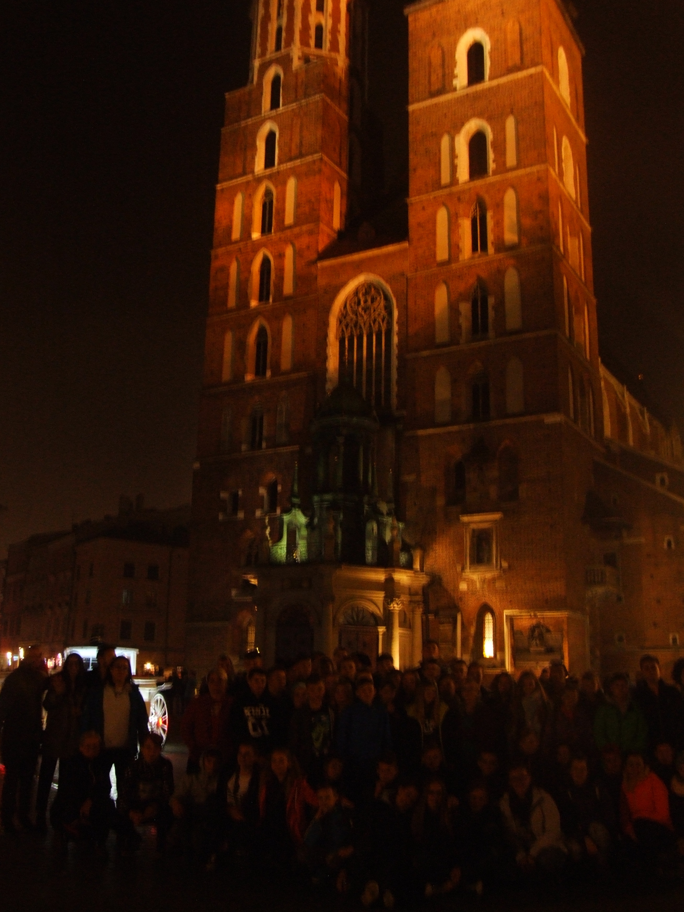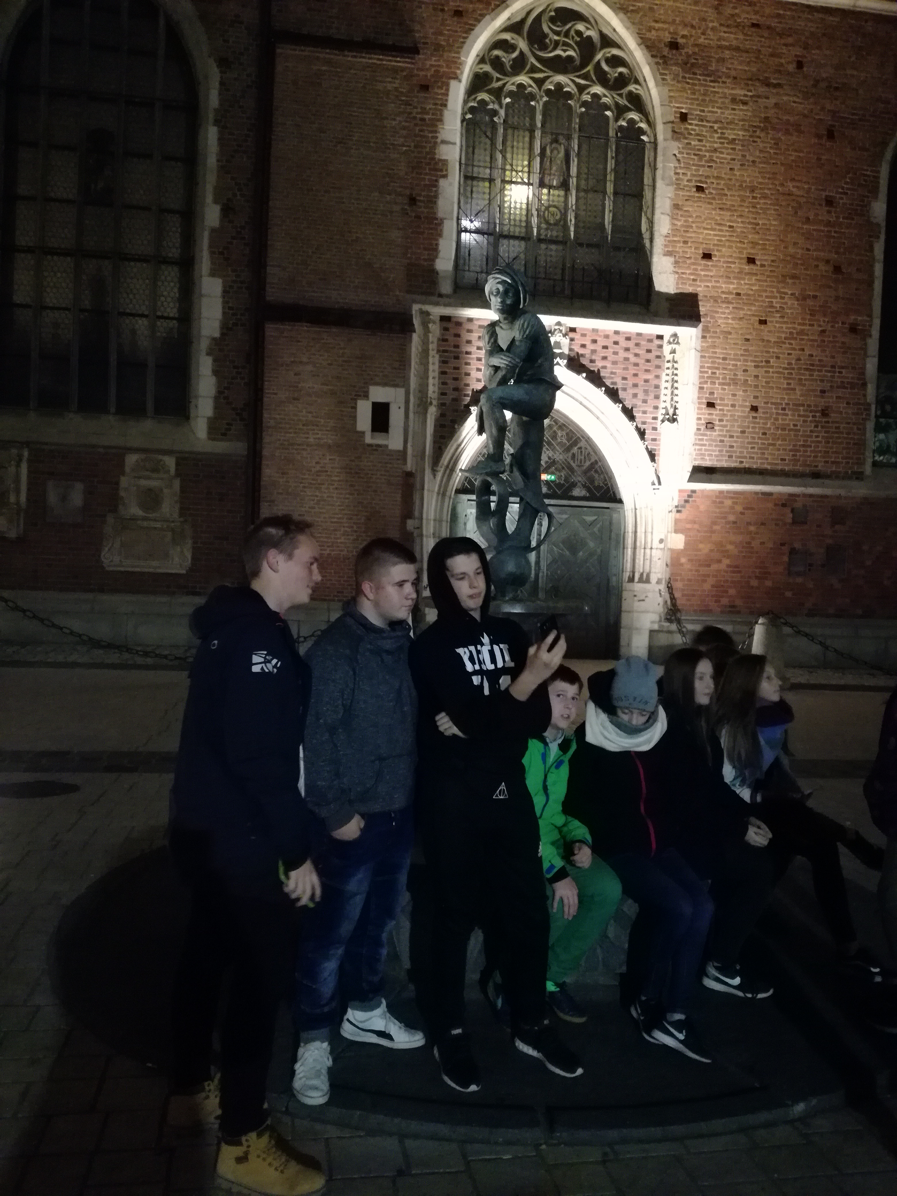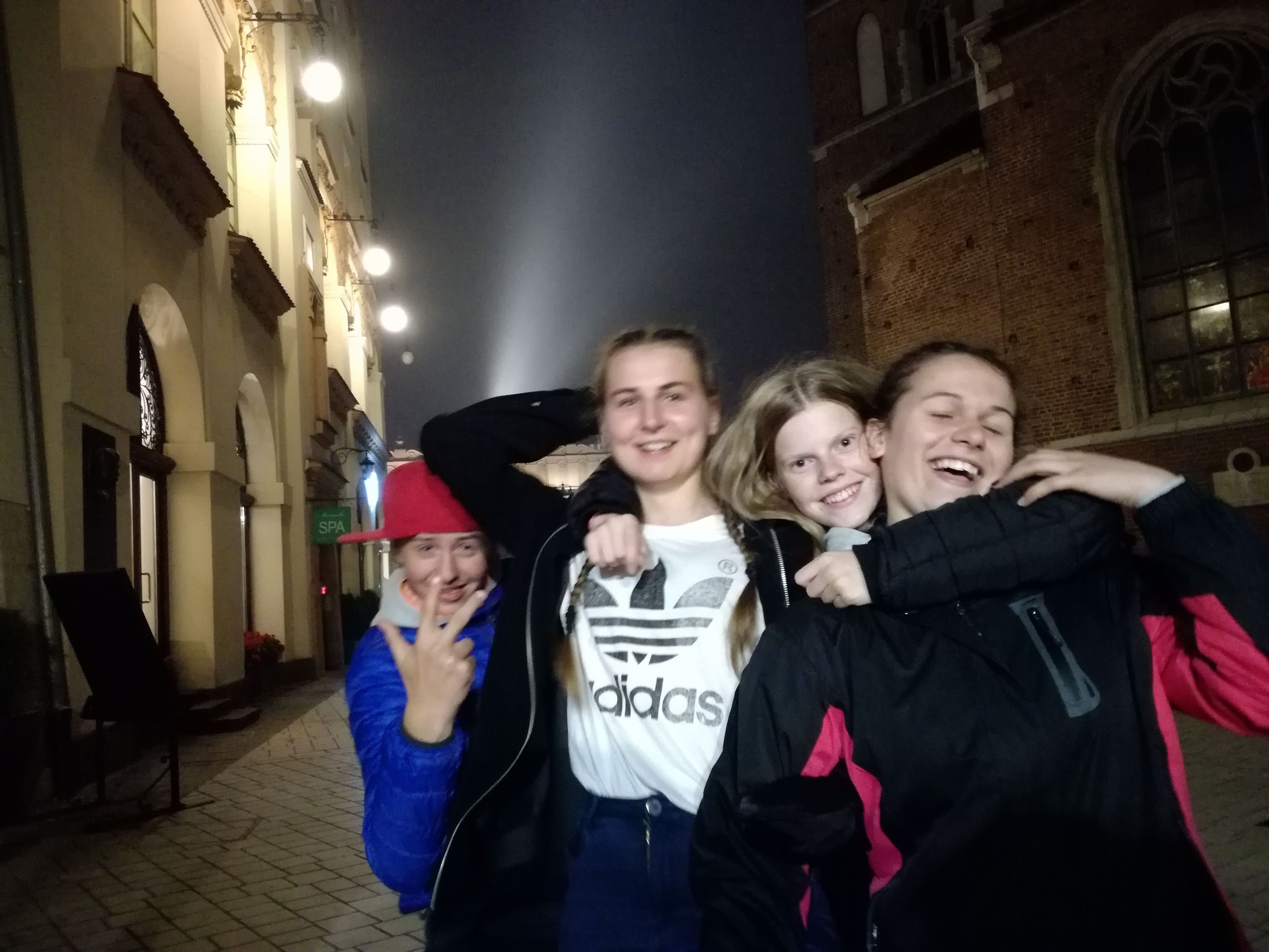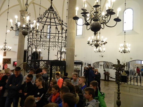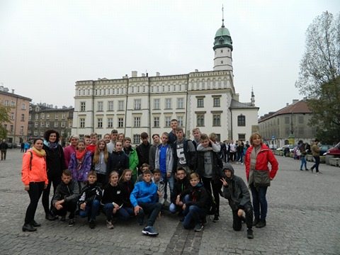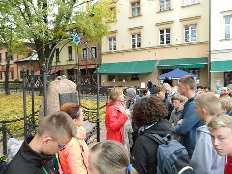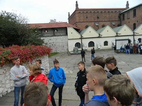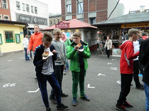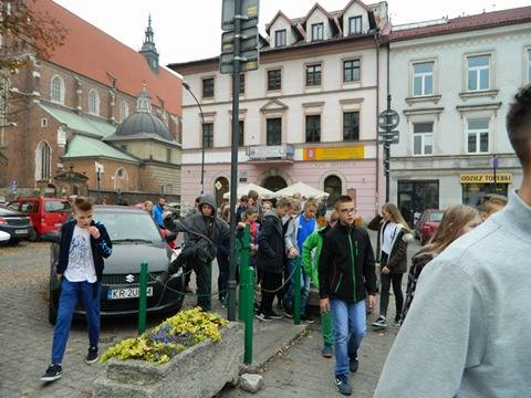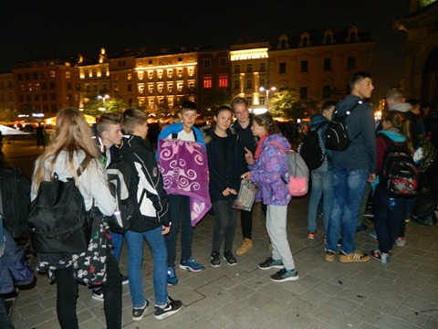 Ostatniego dnia naszej wycieczki udaliśmy się do Krakowa. Pierwszym przystankiem na naszej trasie był Kopiec Kościuszki skąd rozciąga się piękna panorama okolicy. Zwiedziliśmy również zabytkowy XIX- wieczny fort oraz mieliśmy okazję stanąć „twarzą w twarz” z najwybitniejszymi Polakami odwiedzając wystawę figur woskowych. Gdy przybyliśmy do Kazimierza czyli żydowskiej dzielnicy Krakowa, podzieliliśmy się na dwie grupy i z przewodnikami udaliśmy się do dawnej synagogi, która dziś pełni funkcję muzeum. Pani przewodnik opowiedziała nam o życiu codziennym ortodoksyjnych Żydów o ich strojach, posiłkach, zwyczajach. Następnie przeszliśmy uliczkami tej dzielnicy, zajrzeliśmy na cmentarz i weszliśmy do dawnej synagogi, w której dziś znajduje się restauracja. Pani przewodnik poleciła nam zapiekanki przygotowywane właśnie w tej dzielnicy. Były ogromne i pyszne! Wszystkim smakowały. Wieczorem udaliśmy się na niedzielną mszę świętą do kościoła Mariackiego. Po zakwaterowaniu w hostelach spotkaliśmy się na rynku aby posłuchać hejnału z Wieży Mariackiej. Po tak wyczerpującym, pełnym emocji dniu wszyscy błyskawicznie zasnęli.