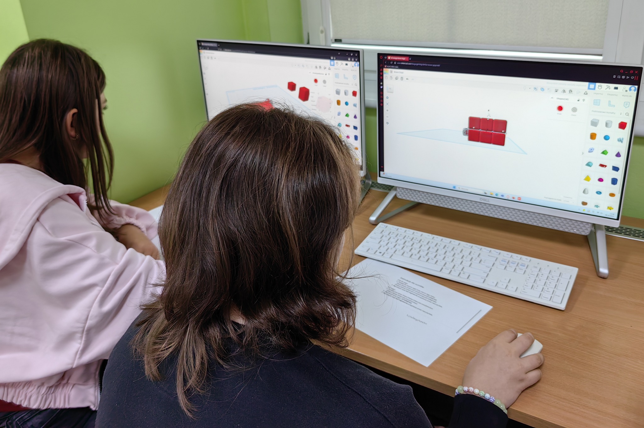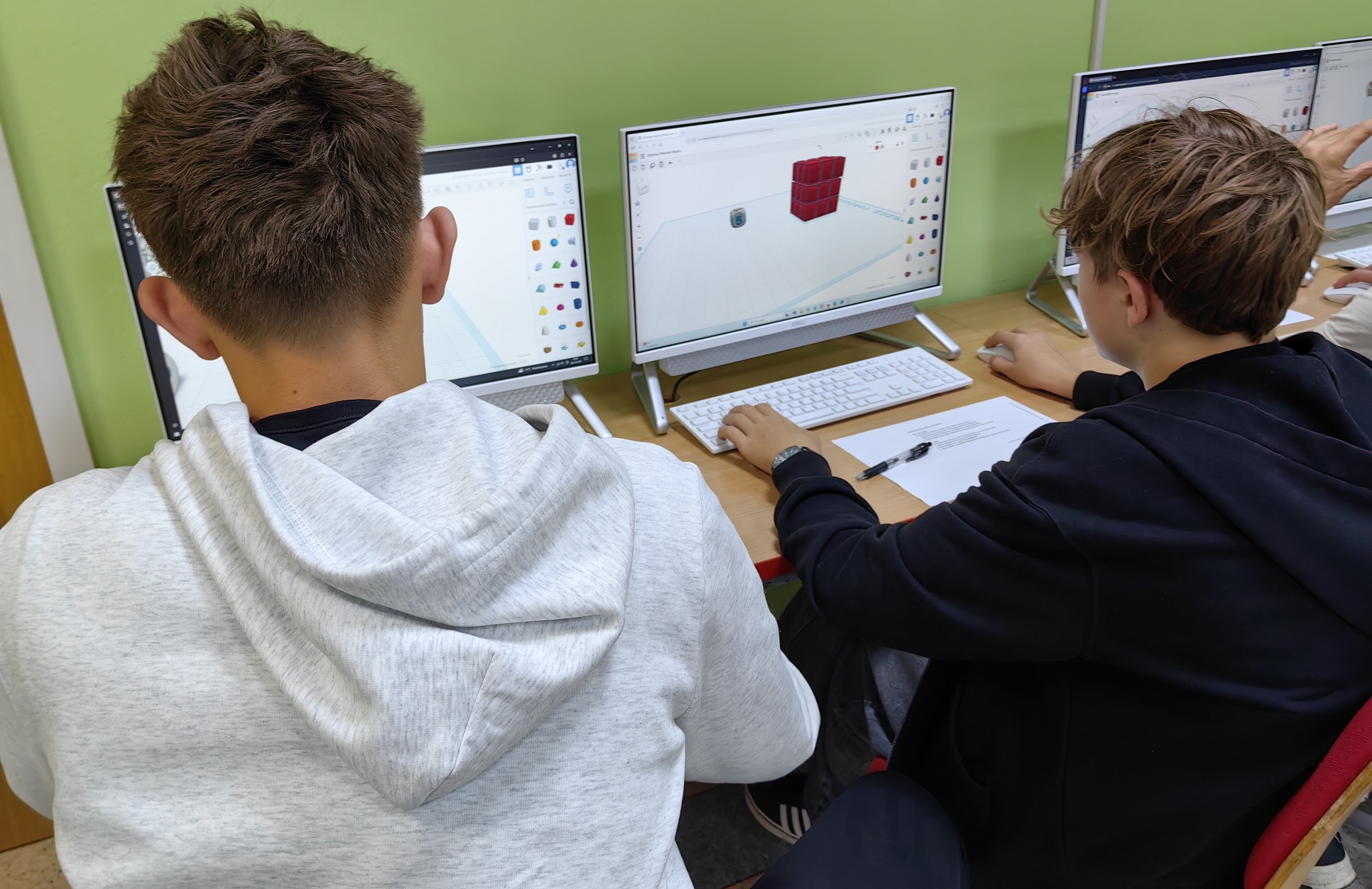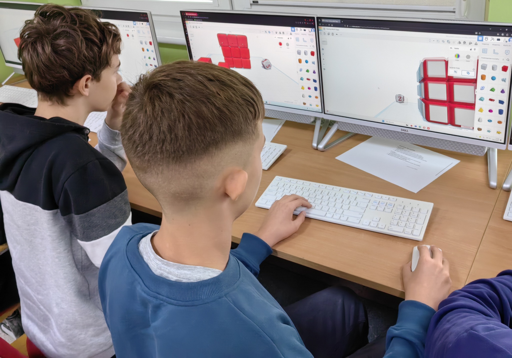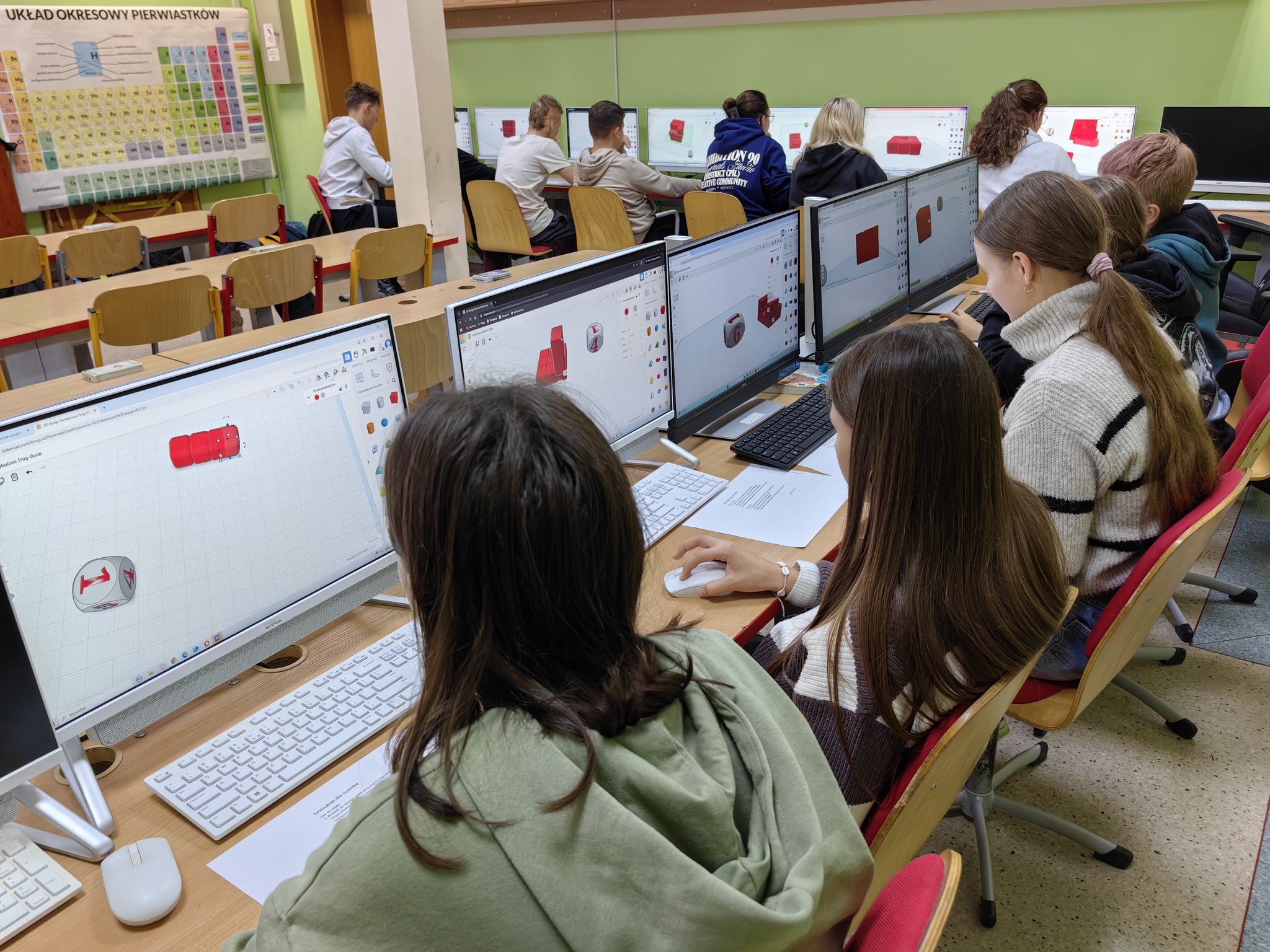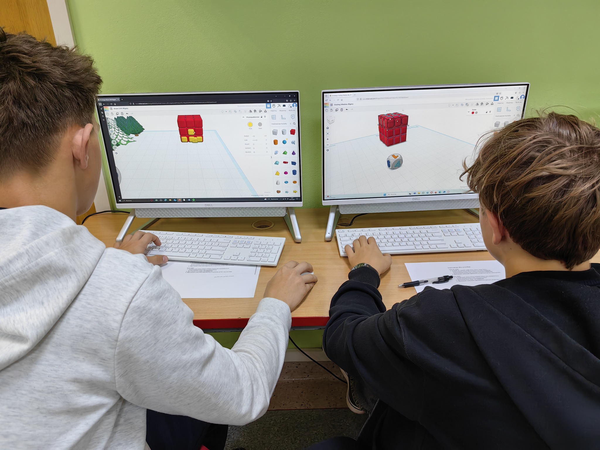 Uczniowie 8 klasy zapoznali się projektowaniem 3D w Tinkercadzie. Program umożliwia projektowanie dowolnych brył w sposób intuicyjny i później generowanie plików potrzebnych do druku zaprojektowanych elementów na drukarkach 3D.